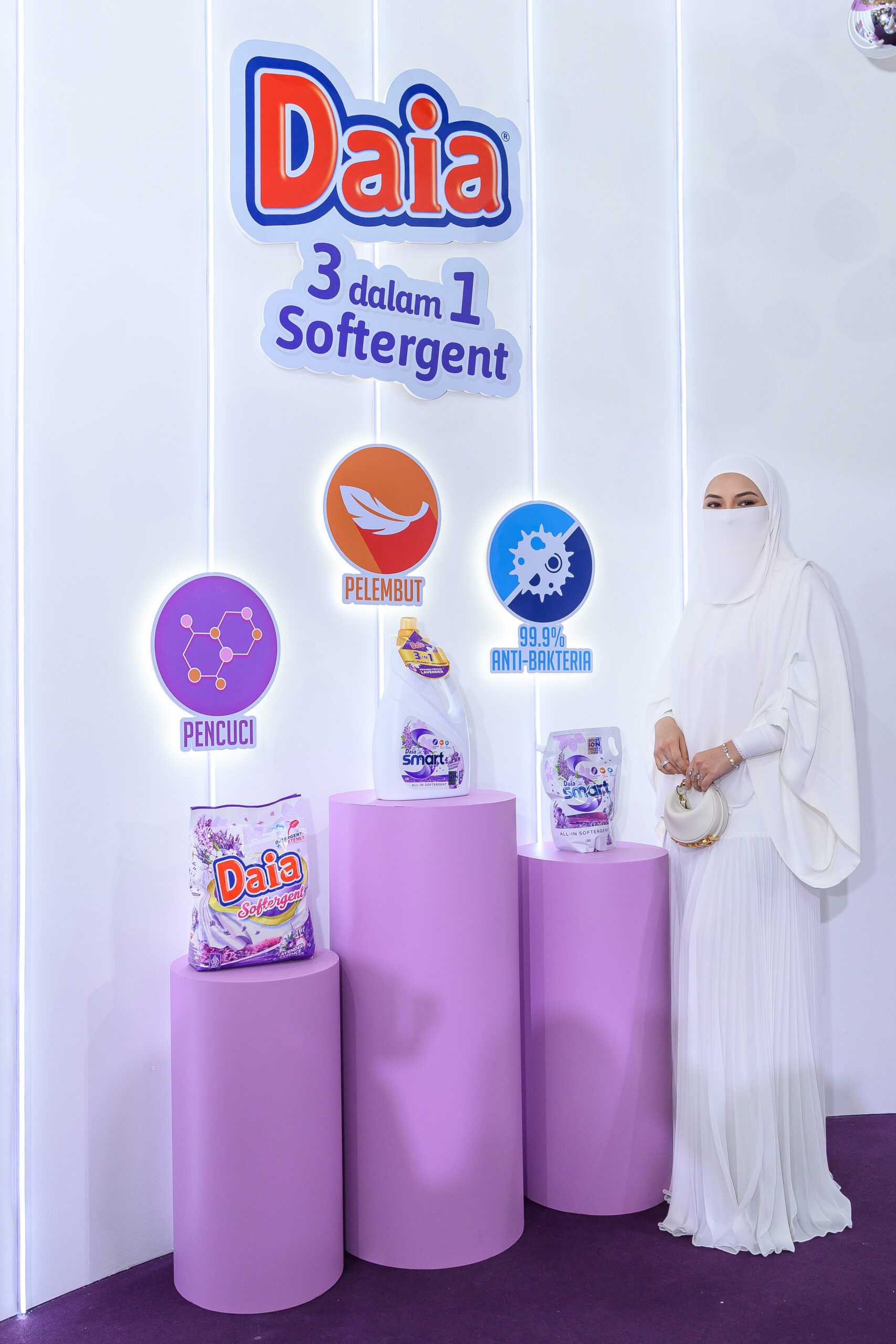 With a graceful poise, Neelofa shared her own experience as a modern mum and entrepreneur. “Daia’s 3-in-1 Softergent Lavender has changed how I do laundry,” she shared during her heartfelt speech. “No more juggling between detergent, softener, and expensive perfumes. This one product handles everything—plus, it smells heavenly!”
