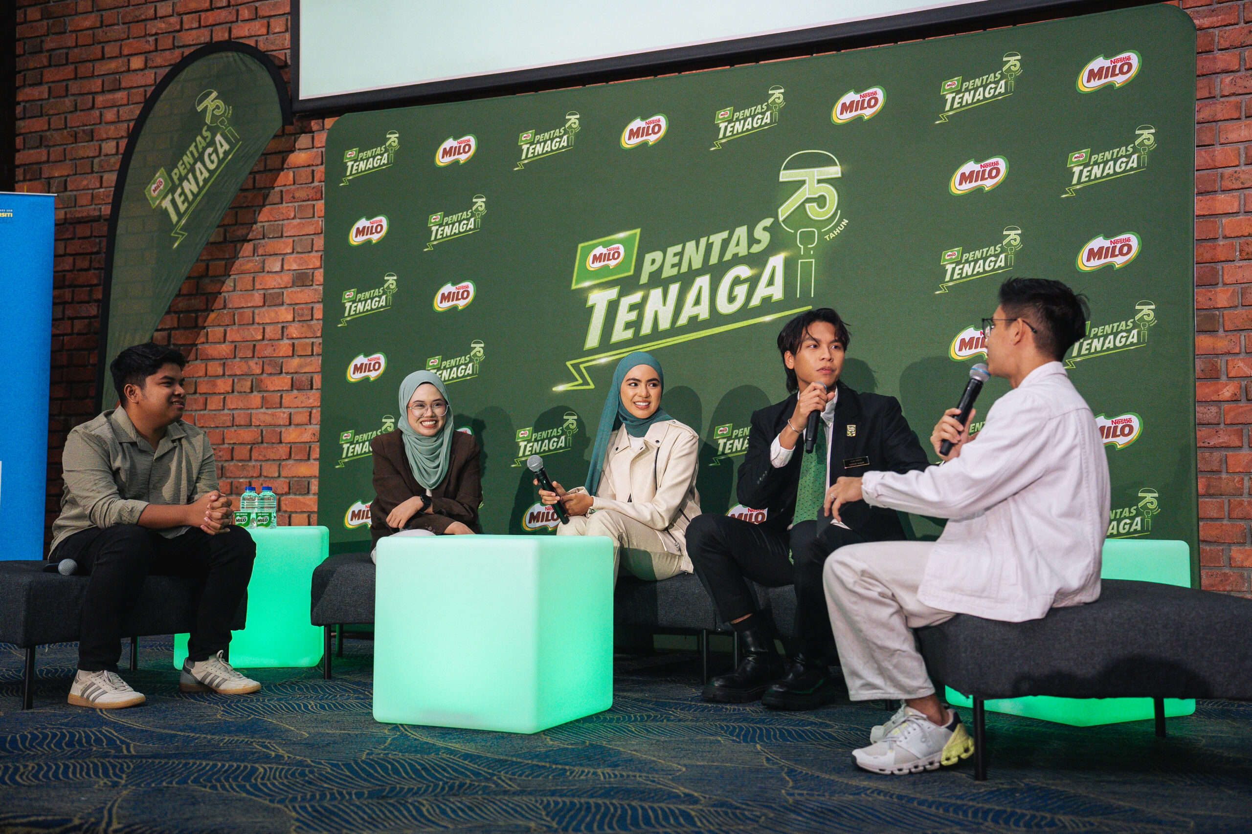 Host engaging with Friends of MILO® Nadhir Nasar and Erysha Emyra, alongside UKM students Nuraliya Natasha & Al-Amin who shared personal stories of courage.