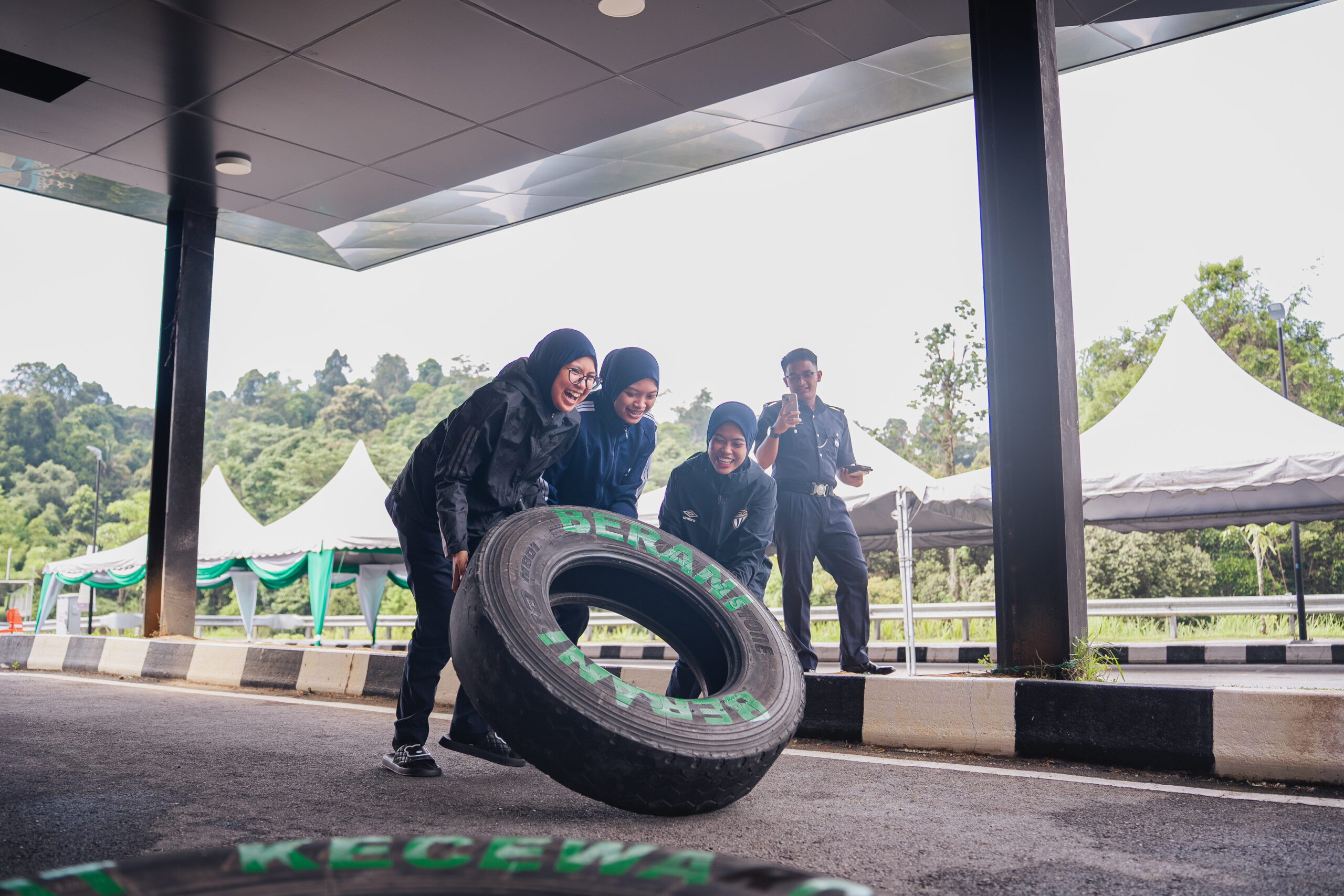 Students worked together to flip a 40kg tyre printed with negative words, revealing positive ones on the other side, demonstrating teamwork and resilience to overcome challenges.
